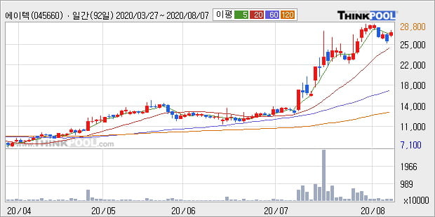 '에이텍' 52주 신고가 경신, 단기·중기 이평선 정배열로 상승세