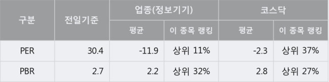 전일 종가를 기준으로 이 종목의 PER는 30.4배, PBR은 2.7배이다. PER는 정보기기업종의 평균 PER -11.9배 대비 +42.3배 높은 수준으로 업종 내에서 상위 11%에 있고, PBR은 정보기기업종의 평균 PBR 2.2배 대비 +0.5배 높은 수준으로 업종 내에서 상위 32%에 위치한다.