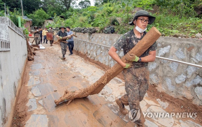 (강원 고성=연합뉴스) 7일 강원 고성군 거진읍 수해복구 현장에 투입된 육군 102기갑여단 장병들이 구슬땀을 흘리고 있다. 2020.8.7