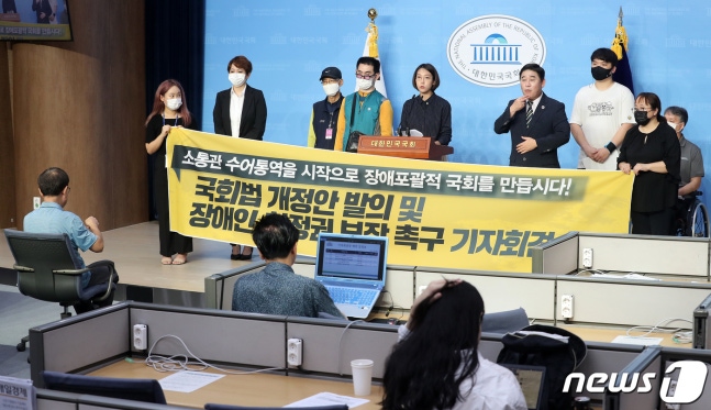 (서울=뉴스1) 박세연 기자 = 장혜영 정의당 의원이 10일 오전 서울 여의도 국회 소통관에서 국회법 개정안 설명 및 장애인 참정권 관제 설명 기자회견을 하고 있다. 조성현 수어통역사(장 의원 오른쪽, 한국수어통역사협회장)가 수어 통역을 지원하고 있다.