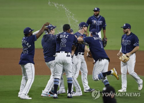 Game hero Tampa Bay Rays first baseman Michael Brosseau (C) is mobbed by his teammates after defeating the New York Yankees in the American League Division Series playoff game five at Petco Park in San Diego, California, USA, 09 October 2020. The Rays defeated the Yankees 2-1 to advance to the American League Championship Series against the Houston Astros. EPA/JOHN G. MABANGLO