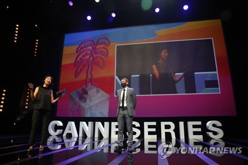 Canneseries president and former French Minister Fleur Pellerin (L) and Mayor of Cannes, David Lisnard (R) attend the opening ceremony of the Cannes Series Festival in Cannes, France, 09 October 2020. The event runs from 09 to 14 October. EPA/SEBASTIEN NOGIER